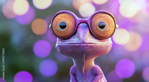 Un caméléon mignon portant des lunettes, avec des couleurs violettes et orange vibrantes, un arrière-plan détaillé et un effet bokeh.