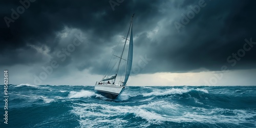 A sailboat is in the middle of a stormy sea. The sky is dark and cloudy, and the waves are rough. The boat is being tossed around by the strong winds and waves