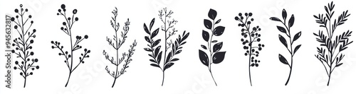 Black silhouette illustrations of various botanical stems and branches with leaves and berries on a white background Generative AI