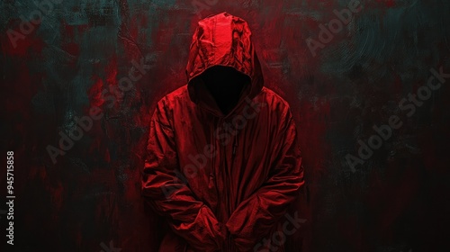 Red jacketed figure with concealed identity, shrouded in mystery. The dramatic pose and lighting enhance the sense of intrigue and secrecy.
