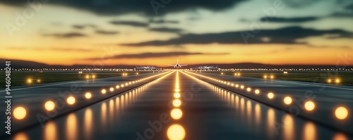 Glowing runway lights at an airport, night flight scene, 3D illustration