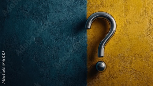A sleek, glossy metallic question mark is centered on a background of two distinct tones, blue and yellow, symbolizing the sharp contrast between known and unknown territories.
