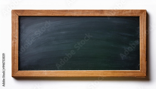 木製のフレームに囲まれた黒板が映し出されています。黒板には何も書かれておらず、滑らかな表面が広がっています。シンプルでクラシックなデザインが特徴で、背景は白で統一されています。generative AI