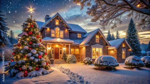 Snowflakes gently fall on a serene winter evening, illuminating a festively decorated house with twinkling lights, wreaths, and a majestic Christmas tree.