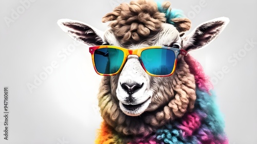 Isolated on a clear PNG backdrop, an abstract depiction of a fashionable sheep wearing sunglasses with multicolored fur on its skin, body, and hairs...