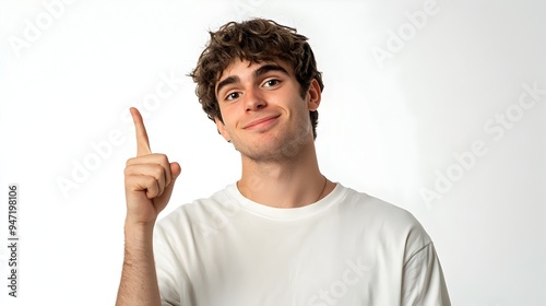 Young man making a playful finger gun gesture with a cheerful expression on a white background