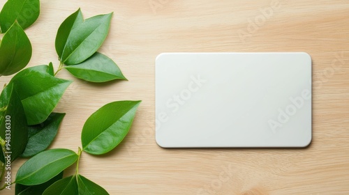 Blank name plate, resting on a wooden desk with soft green foliage, minimalist nature, isolated