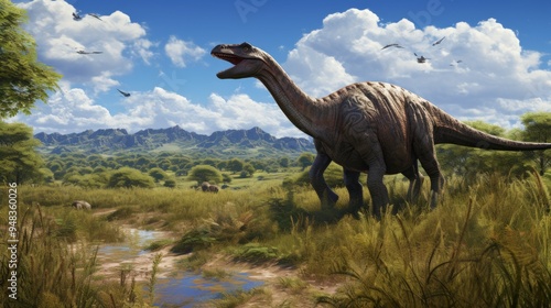 A dinosaur roams a prehistoric landscape filled with lush greenery and distant mountains under a clear blue sky