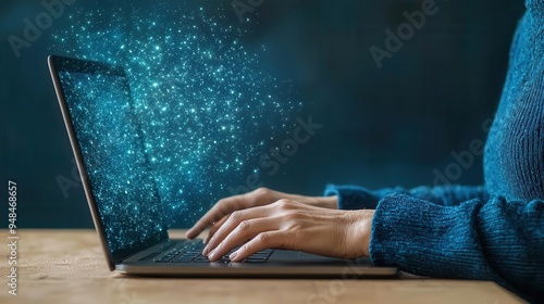 A person with a visual impairment using a screen reader to participate in an online chat focus on, connectivity theme, dynamic, Double exposure, digital interface backdrop