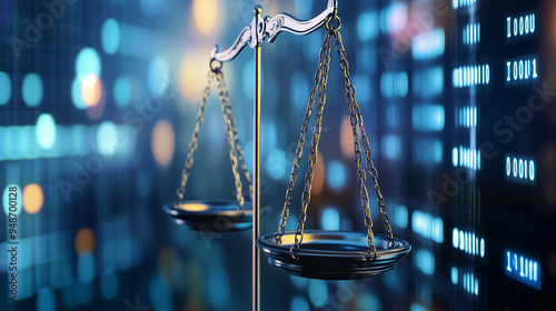 Waga prawa, której klasyczny symbol kontrastuje z tłem nowoczesnego centrum danych, pełnego serwerów i cyfrowych ekranów.