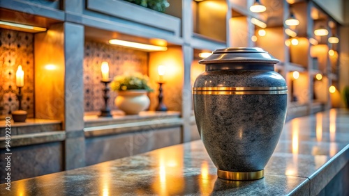 Marble cremation urn with gold accents in a niche of a memorial hall