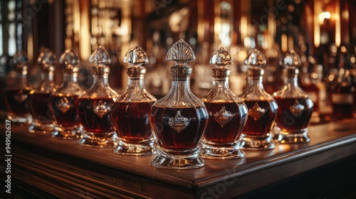 Unbranded brandy bottles arranged in a row on a bar counter, capturing the essence of refined drinking culture.