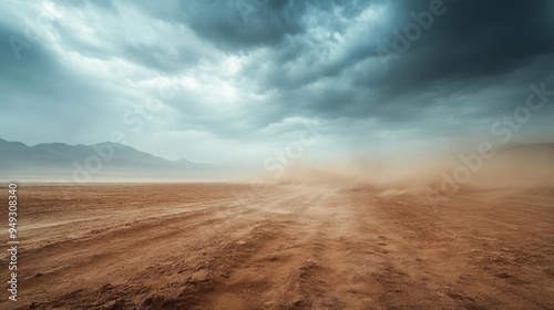 Dramatic landscape depicting a dusty terrain under ominous storm clouds, capturing the essence of nature's raw power.