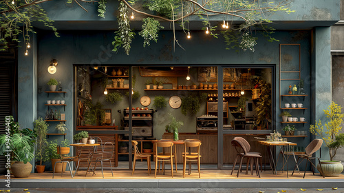 Exterior facade of cafe shop and restaurant design Scandinavian style. Front elevation Wood and concrete material with garden view
