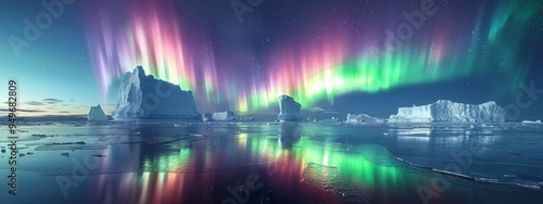 Aurora Australis A breathtaking display of the Southern Lights dancing across the night sky, reflecting on the icy landscape.