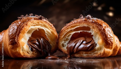 Un croisant muy sabroso cortado por la mitad, relleno de cremoso chocolate