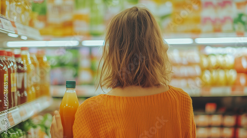 Kobieta z tyłu w sklepie spożywczym, przeglądająca butelkę soku na półce. Stylowe ubranie i koncentracja na wyborze podkreślają indywidualne podejście do zakupów.