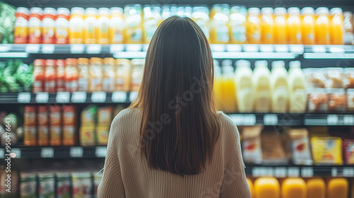 Kobieta z tyłu w sklepie spożywczym, przeglądająca butelkę soku na półce. Stylowe ubranie i koncentracja na wyborze podkreślają indywidualne podejście do zakupów.