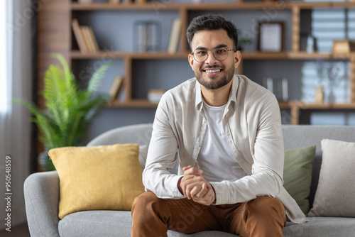 Smiling man sitting comfortably on sofa in modern living room interior with cozy and elegant decor