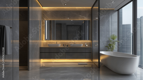 Luksusowa łazienka w odcieniach szarości z marmurowym wykończeniem. Podwójna umywalka i wolnostojąca wanna tworzą nowoczesną i funkcjonalną aranżację.