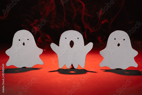 tres fantasmas amigables de cartón blanco con fondo humeante e iluminados por luz roja