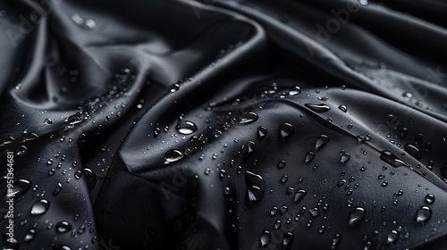 A view of a hydrophobic black cloth up close with droplets of liquid on it
