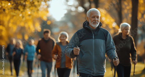 Elderly man and family doing nordic walking in park, all wearing sportswear, older person holding sticks or poles for support while moving outdoors
