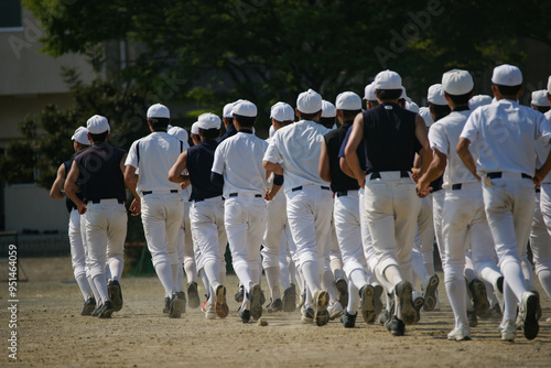 試合前に集団でランニングする野球部員たち
