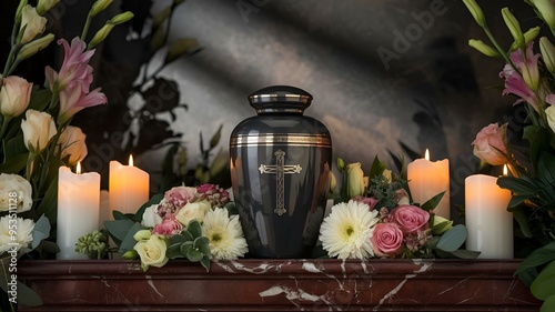 Elegant urn surrounded by fresh flowers and candlelight in a church, representing a serene and respectful memorial service for a loved one