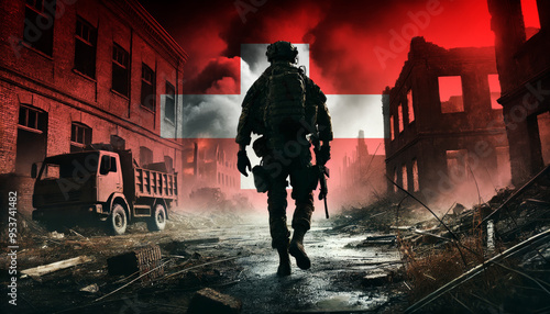 A lone soldier walking through a war-torn urban landscape with the Switzerland flag overlay, symbolizing the bravery and resilience of military forces in conflict zones.