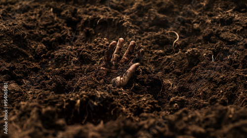 A hand coming out of the dirt reaching up buried alive zombie Halloween