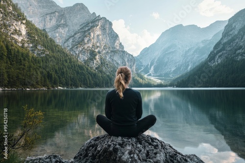 Serene Meditation by a Mountain Lake in the Heart of Nature during a Calm Morning