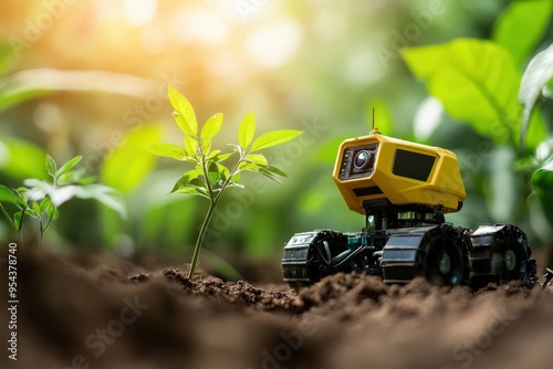 A tiny robot nurtures a young plant in vibrant green surroundings, showcasing innovation in technology and agriculture.