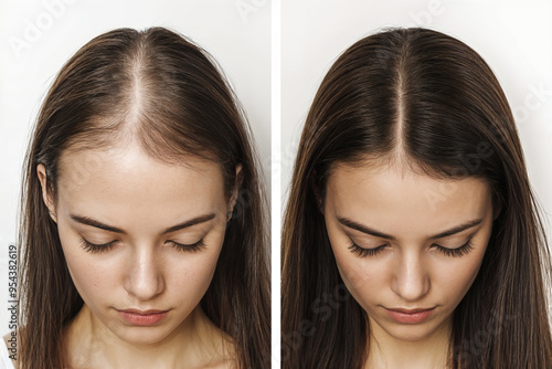Before and after hair restoration in female patient. Illustration of transformation in hair density and scalp health post transplantation. Woman with hair loss problem. Hairloss treatment, collage.
