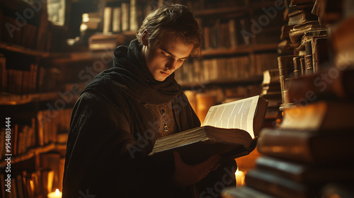An old-fashioned library filled with ancient books, dimly lit by candlelight, a young scholar in medieval attire reading a large, dusty tome