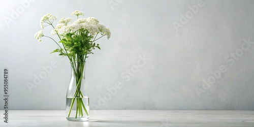 Delicate, clear glass vase stands tall on a minimalist surface, its slender neck and rounded body filled with lush, vibrant greenery and delicate white blooms.