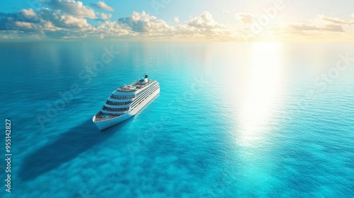 A majestic cruise ship sailing through calm, turquoise waters, with passengers relaxing on deck under a bright, sunny sky.