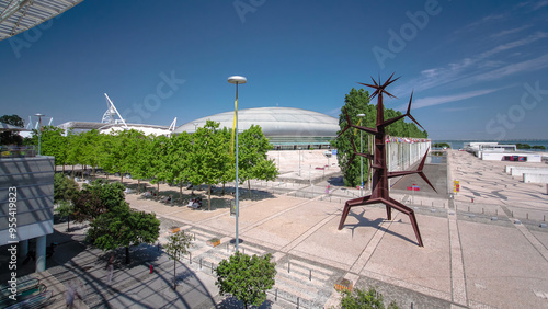 Modern Sculpture and Shopping Centre in Parque das Nacoes, Park of Nations, Lisbon, Portugal timelapse