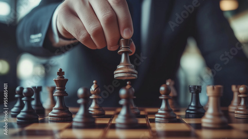 Mężczyzna w garniturze przesuwa pionka na szachownicy, symbolizując strategiczne myślenie i planowanie.