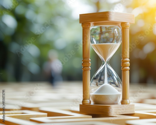 A beautiful hourglass showcasing flowing sand, symbolizing the passage of time amidst a serene natural backdrop.