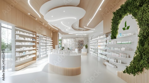 Sleek and Modern Pharmacy Interior with Organized Medication Displays and Ambient Lighting