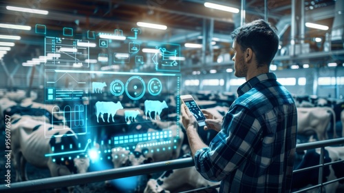 A farmer uses technology and digital tools to monitor livestock in a modern barn, showcasing the integration of advanced farming methods.