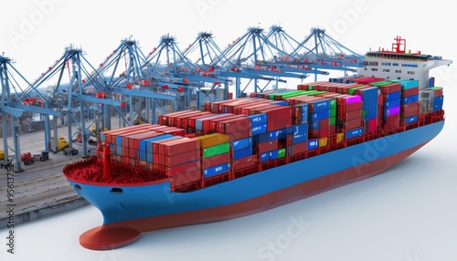 The image depicts a large cargo container ship docked at a busy port, with cranes actively loading and unloading containers, representing the bustling activity of international trade and shipping.