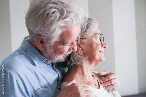 Side view of a mature couple embracing lovingly at home during their leisure time. An elderly man holds his wife from behind, capturing their romantic and protective bond, showcasing senior affection