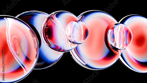 Transparent glass spherical oil-like liquid bubbles reflecting lighting in blue and red tones, arranged linearly in the centre of the frame. 3D background for website or presentation, black background