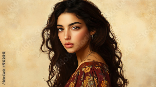 Kobieta w wieku 30 lat z brązowymi włosami, pozująca na jednolitym, kremowym tle. Wyrazista i pełna wdzięku, idealnie prezentuje się w tej spokojnej i eleganckiej scenerii.