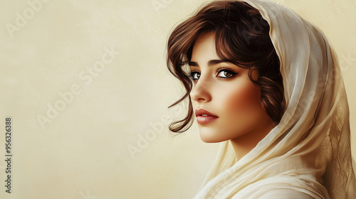 Kobieta w wieku 30 lat z brązowymi włosami, pozująca na jednolitym, kremowym tle. Wyrazista i pełna wdzięku, idealnie prezentuje się w tej spokojnej i eleganckiej scenerii.