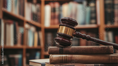 Biurko z młotkiem sędziowskim i książkami prawniczymi, tworzące profesjonalne otoczenie dla pracy w kancelarii prawnej.