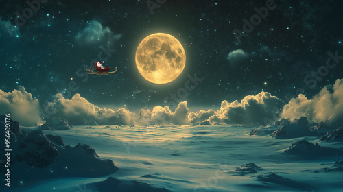 Malowniczy krajobraz Bieguna Północnego z rozświetlonym pełnią księżyca niebem i saniami Mikołaja. Czarująca noc Bożego Narodzenia, wypełniona świąteczną magią.