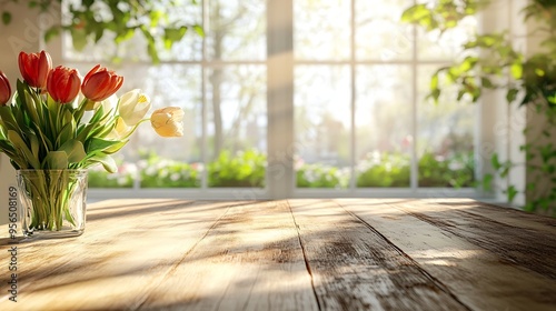 Table background of free space and kitchen interiorWhite wall with shadows and sunny warm morning timeCopy space for your composition Easter table with spring flowers in a sunny April : Generative AI